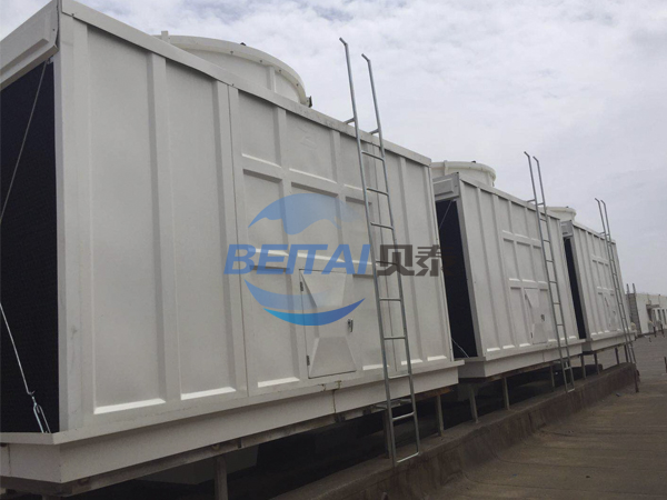 橫流式玻璃鋼冷卻塔內(nèi)的填料采用兩面有凸點的點波片,通過安裝頭使點波片粘結(jié)成整體,以提高剛性,兩面的凸點還可避免直接滴水,因此提高了水膜形成能力,填料尾部設(shè)有收水措施。